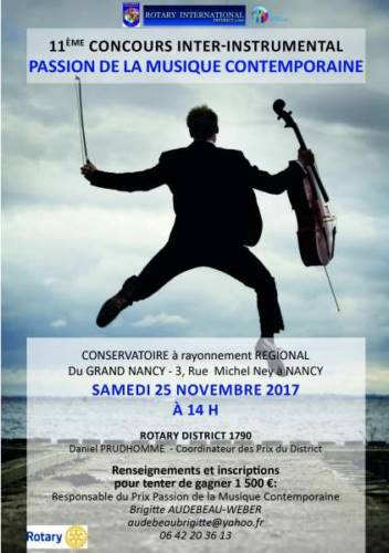 Concours de musique sur le thème de la musique contemporaine organisé par le Rotary avec un jury composé de professionnel de la musique du Conservatoire du Grand Nancy. Venez écouter et encourager les jeunes participants pour ce concours à partir de 14h.