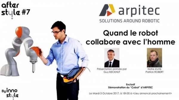 sera exposé le mardi 3 Octobre 2017 à 18h30. Vous y êtes cordialement convié pour nous rejoindre et voir le ’Cobot’ à l’oeuvre.Patrick ROBERT, CEO du Groupe ARPITEC, sera notre invité pour la rentrée de la saison 2017/2018. Il nous exposera sa vision de la ’Robotique 2.0’. Sa chance est d’avoir assisté aux débuts de la robotique, en Allemagne. Et son expérience lui permet d’entrevoir l’avenir de la robotique. Pour lui, l’avenir est dans la collaboration et non dans la substitution. Que veut dire un robot qui collabore avec l’homme - Et comment est-ce possible - C’est ce que M. Robert tâchera de vous démontrer avec son ’Cobot’ qui sera présent lui aussi.