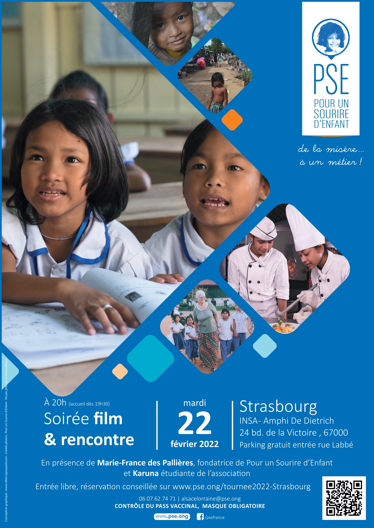 Soirée film et rencontre, INSA 24 boulevard de la Victoire Strasbourg, en présence de Marie-France des Pallières, fondatrice de l'association Pour Un Sourire d'Enfant (PSE) et de Karuna étudiante de l'association.