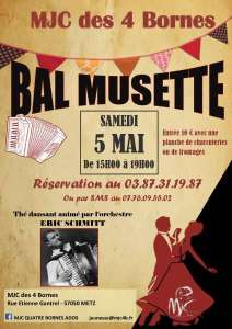 Samedi 05 Mai de 15h00 à 19h00 la MJC des 4 Bornes organise un Bal Musette thé dansant avec l’orchestre Eric Schmitt.