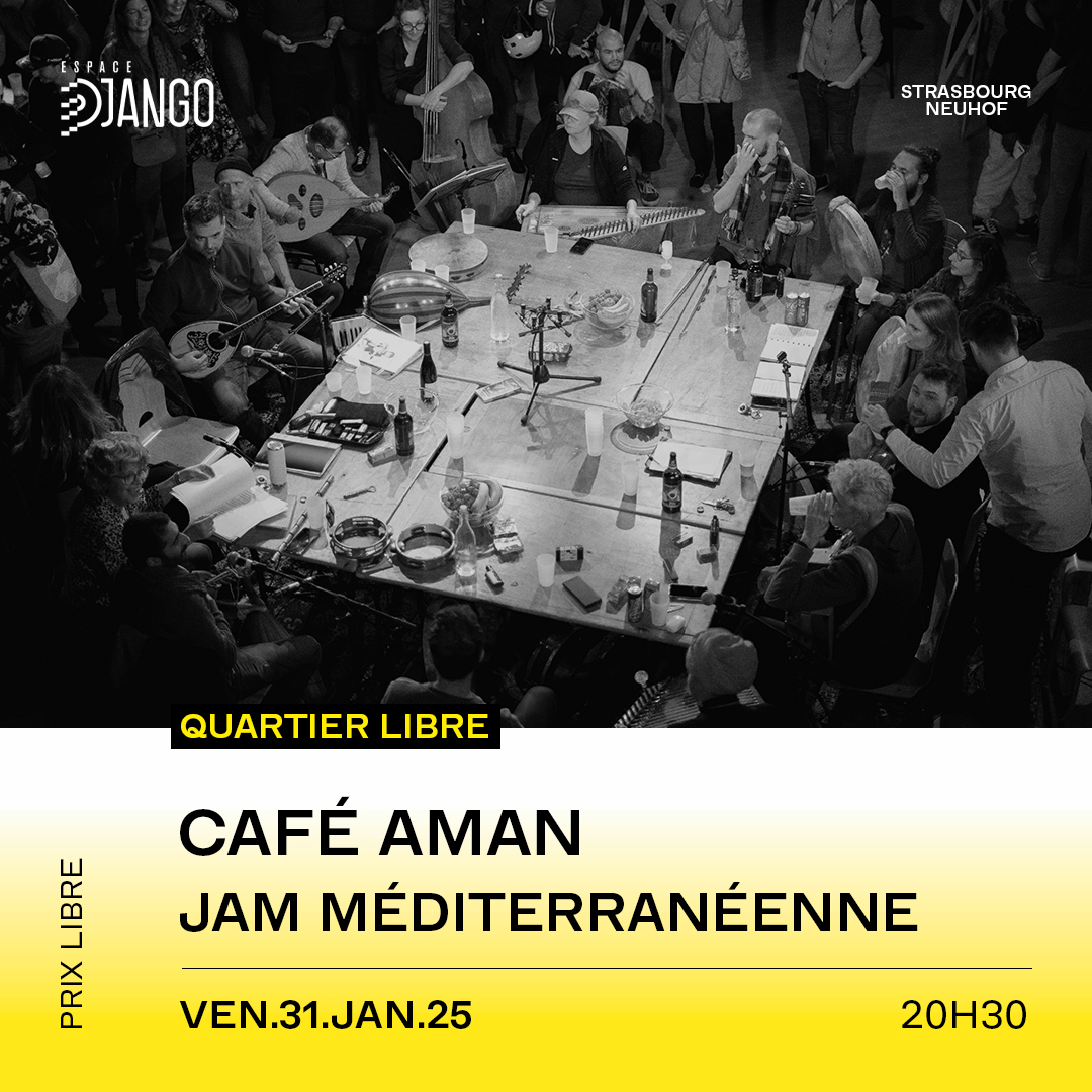 Le collectif Café Aman s’est installé depuis 2019 dans le paysage strasbourgeois en proposant des jam-sessions autour des musiques de Grèce, de Turquie et du Proche-Orient. Né de l’envie de pratiquer ces musiques dans un cadre convivial, le Café Aman crée un espace où des musicien·nes issu·es de communautés et traditions différentes, partageant un langage musical commun, peuvent se rencontrer de manière informelle en invitant le public à interagir et profiter de la richesse de cette expérience sonore.
