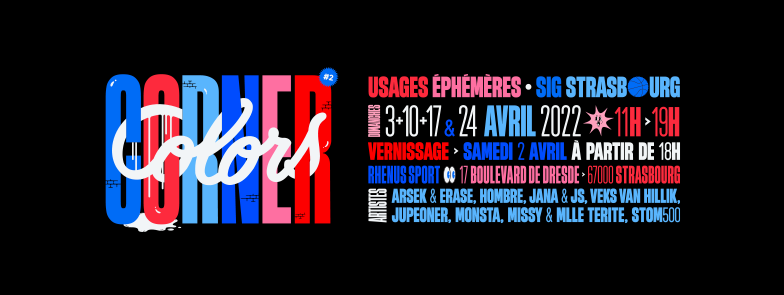 COLORS Corner reste fidèle aux valeurs qui nous tiennent à cœur (gratuite, ouverte à toutes et à tous et où les artistes sont justement rémunéré.e.s), exposant des créateurs locaux et (inter)nationaux en un lieu inattendu et provisoire. Cette seconde édition, COLORS CORNER #2 – Usages éphémères, convie Arsek & Erase, Hombre, Jana & JS, Veksvanhillik, Jupe, Missy X Mlle Terite, Monsta, Stom500 à prendre procession des murs du Rhenus Sport.
