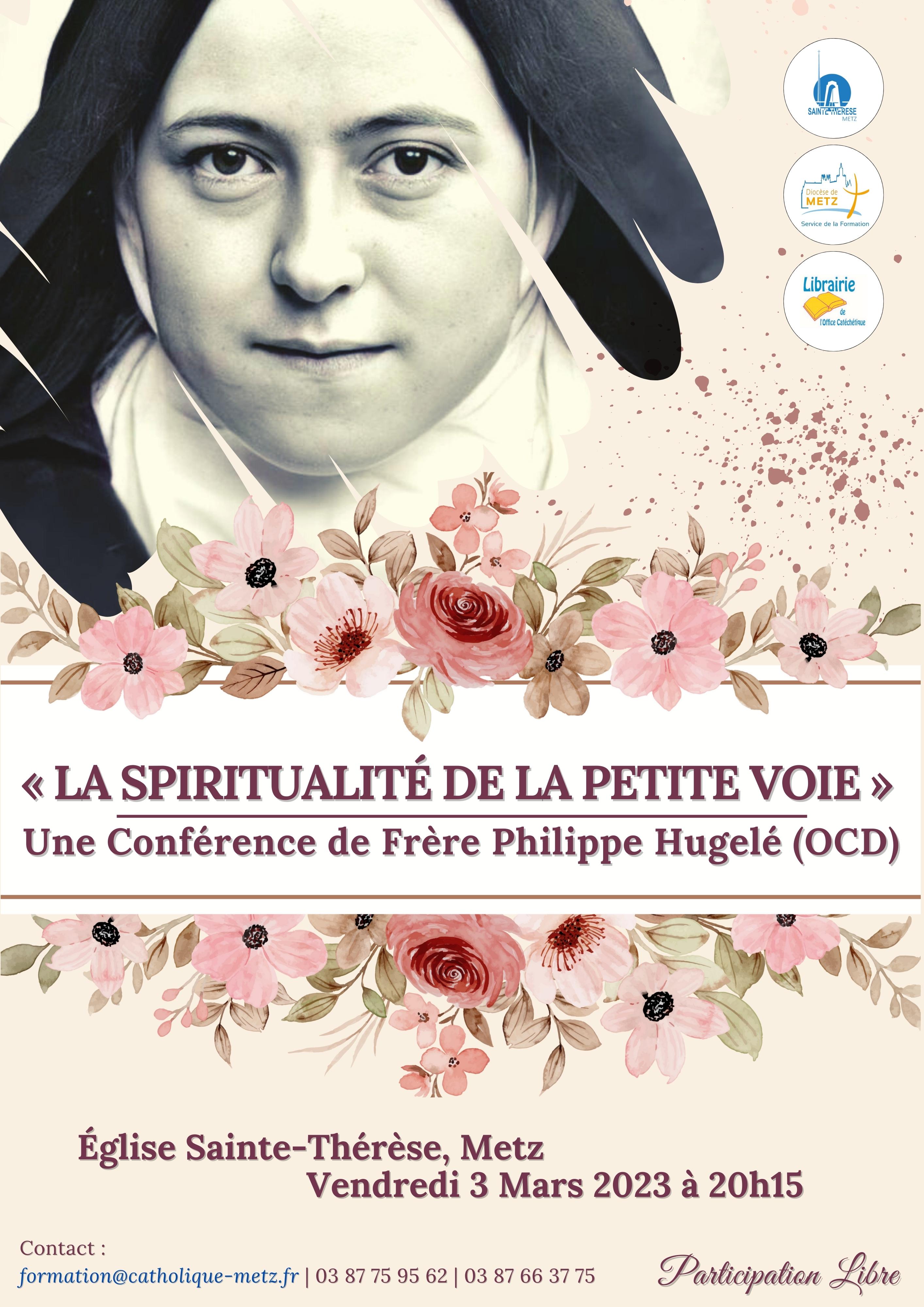 Fruit d’une étroite collaboration entre la Paroisse Sainte-Thérèse de Metz et le Service de la Formation, une conférence consacrée à la « Spiritualité de la Petite Voie » sera menée par le Frère Philippe Hugelé (OCD) le vendredi 3 mars 2023 à partir de 20h15 à l’église Sainte-Thérèse (31 Rue de Verdun, 57000 Metz). La librairie de l’Office Catéchétique tiendra un stand sur place.