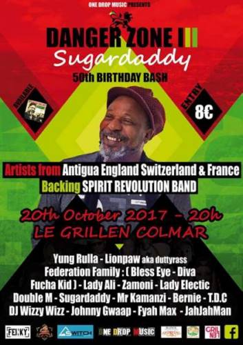 Rendez vous le 20 octobre au Grillen pour un big show full of vibes !!! Danger zone 3 rassemble une vingtaine d’artistes d Antigua, Angleterre, Suisse et France tous réunis au Grillen pour célébrer le 50e anniversaire du king Sugardaddy !! Venez share la uplifting good vibe !!!