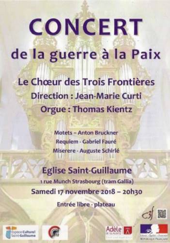 Le concert labellisé bénéficie du soutien de la Mission du Centenaire de la Première Guerre mondiale et s’inscrit dans un week-end de manifestations commémoratives à Saint-Guillaume avec notamment les 16 et 18 novembre la lecture scénique « Novembre 18 » d’après Alfred Döblin par l’association « à livre ouvert…wie ein offenes Buch ».