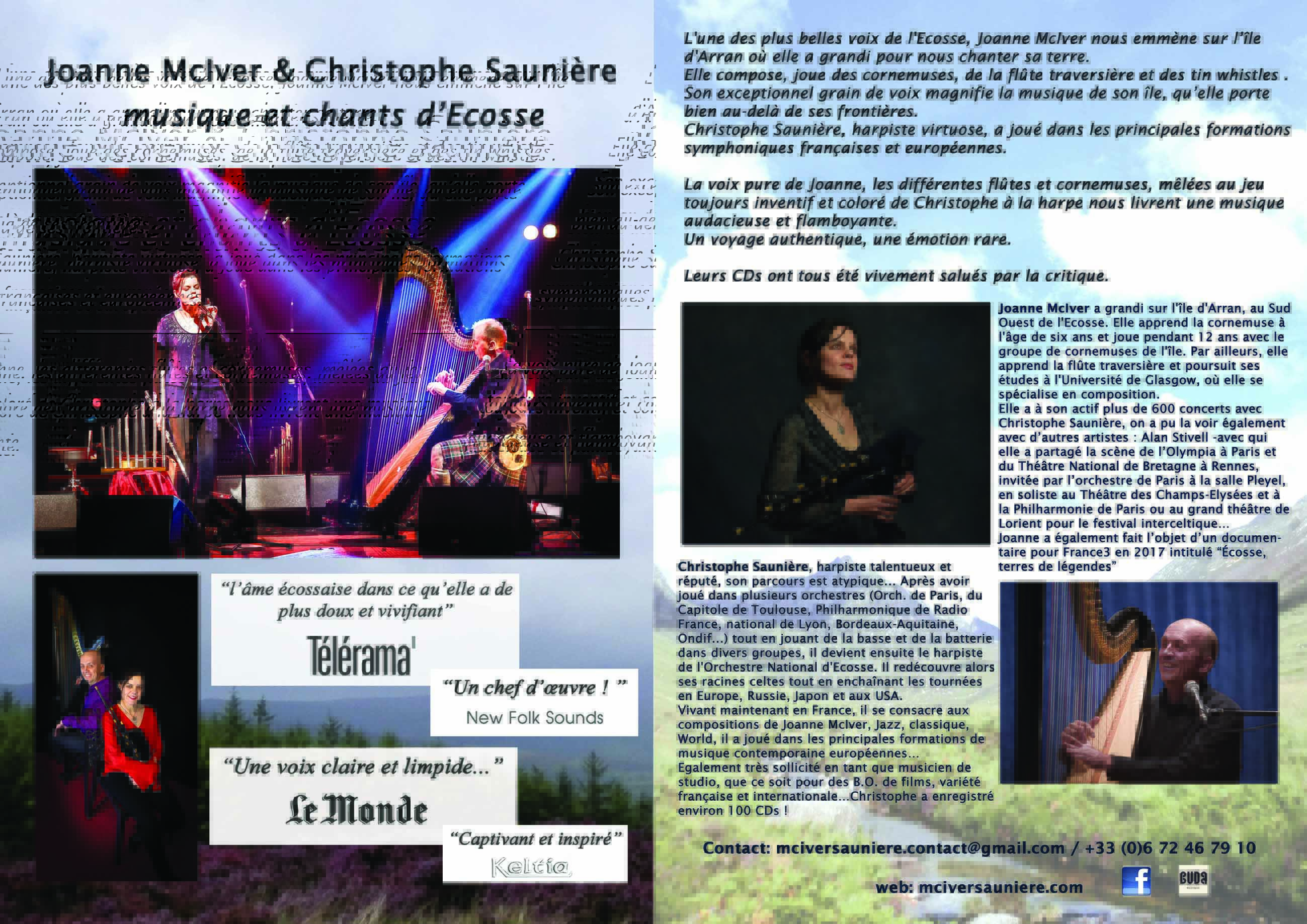 Christophe Saunière, harpiste virtuose, a joué dans les principales formations symphoniques françaises et européennes. La voix pure de Joanne, les différentes flûtes et cornemuses, mêlées au jeu toujours inventif et virtuose de Christophe à la harpe nous livrent une musique audacieuse et flamboyante.