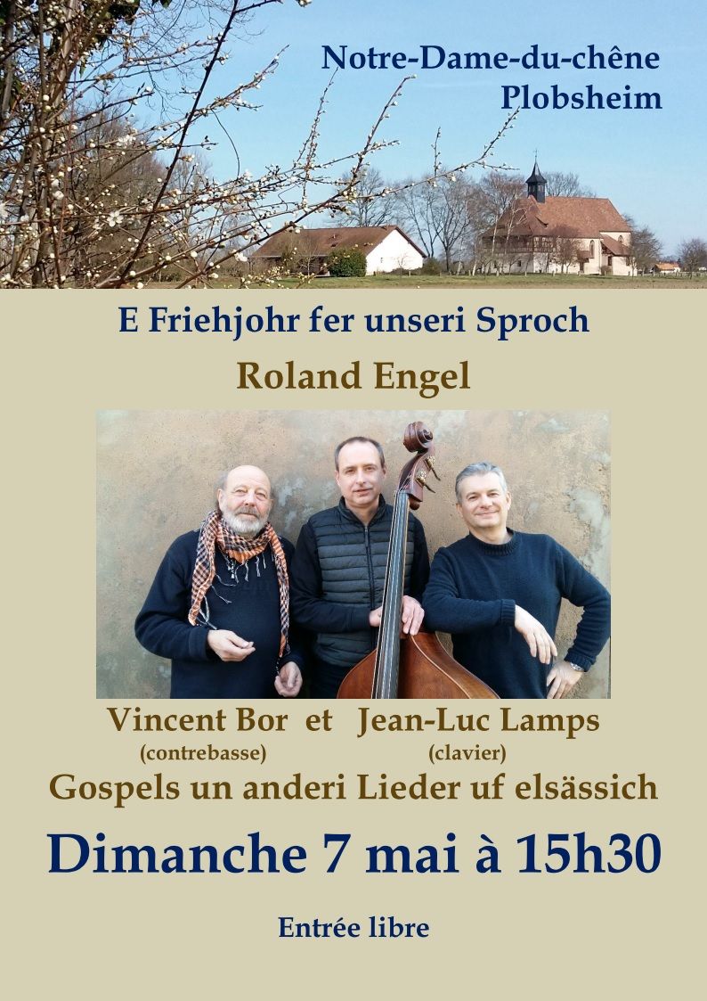 Dans le cadre du printemps des langues régionales « E Friehjohr fer unseri Sproch » Roland Engel, accompagné par Vincent Bor à la contrebasse, et Jean-Luc Lamps au piano, invite à un concert intégralement en alsacien, de gospels, de blues et de chansons plus personnelles, dans l’écrin de la Chapelle « Notre-Dame-du-Chêne » à Plobsheim.