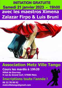 Ce samedi 21 janvier à 19 heures faites vos premiers pas avec des maestros ayant débuté leurs carrières de danseurs à Buenos Aires, de réputation internationale et excellents pédagogues : Xiména  Zalazar Firpo qui enseigne et anime Estro Tango à Mulhouse et Luis BRUNI qui enseigne à Paris, au Havre et à Metz.