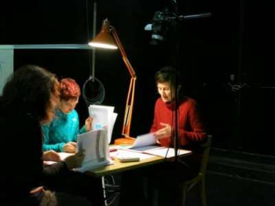 Dans Quant à Je (Kantaje), P.O.L. 1996, l’auteure d’origine hongroise Katalin Molnar, arrivée en France à 28 ans, mêle phrases transcrites phonétiquement, mots anglais, conjugaisons curieuses et jeux typographiques. Ce fameux « il y a l’écrit sans parole, épui yalaparol sanlékri », la comédienne et metteure en scène Anne Ayçoberry ne voulait pas s’en priver. Entourée de deux autres interprètes, ce trio met en jeu, voix et images l’histoire d’un exil, d’une vie de femme dans sa relation aux enfants, aux hommes, à sa famille, à son pays d’origine et à celui qui l’accueille, la France. Elles tricotent les mots à l’envers, à l’endroit, et tentent l’aventure d’un véritable exil langagier.