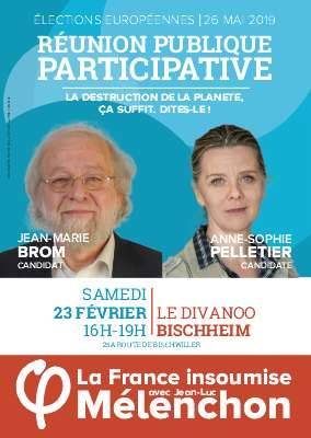 "LA DESTRUCTION DE LA PLANÈTE CA SUFFIT!" Réunion publique de 16h à 19h au DIVANOO (25A route de Bischwiller) Sera précédée par la présence du HOLOVAN de La France insoumise (parcours de 471 villes de France) place de la République (place du marché), entre 9h30 et 13h30. Au programme : discours holographiques, rencontres avec les candidat·e·s (en chair et en os) Anne-Sophie Pelletier et Jean-Marie Brom, discussions politiques et accès aux droits sociaux et civiques. Venez nous rejoindre sur cette étape à Bischheim!