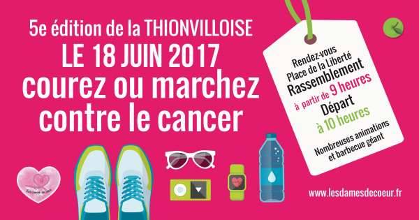 La Thionvilloise 2017 est ouverte aux femmes et aux hommes de tous âges. Pas de chronométrage ni de distance imposée. L’inscription – en individuel ou en groupe - est de 12 € (pour les participants de + de 12 ans au jour de la manifestation) comprenant le t-shirt de cette 5ème édition. Date limite des inscriptions en ligne le 09 juin 2017 minuit via le site (fin des inscriptions papier le 5 juin 2017 - possibilité de s’inscrire le samedi 17 juin 2017 sur place de 09h à 16h + dimanche 18 juin de 08h à 09h30). Bulletin d’inscription via notre site www.lesdamesdecoeur.fr