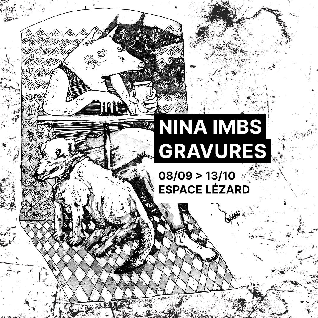 Drôles et sombres, les personnages de ses images sont habités. Ils paraissent souvent absorbés dans un lointain intérieur mais sont très proches les uns des autres. Caractériels, taillés à la hache, ils vibrent pourtant d'une mystérieuse douceur. Nina Imbs grave le bois et le métal et en fait patiemment émerger des vies possibles, dans des formats jamais assez grands pour toutes les contenir. Un pied qui s'invite, le regard oblique d'un chien, une fenêtre ouverte, tout nous attache à un présent palpable mais nous attire ailleurs, hors champ. Dans cette première exposition solo, nous avons la joie de découvrir les dernières productions de cette artiste graveuse strasbourgeoise qui aime tant observer les chiens, les gens dans les bars, les chiens dans les bars des gens, et la vie en général."