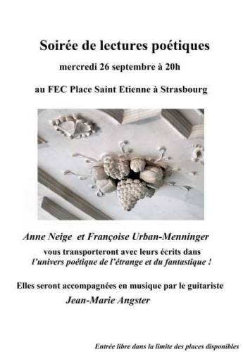 Lectures de textes poétiques sur le thème de l’étrange et de la métamorphose de et par Anne Neige et Françoise Urban-Menninger. Accompagnement musical à la guitare par Jean-Marie Angster.