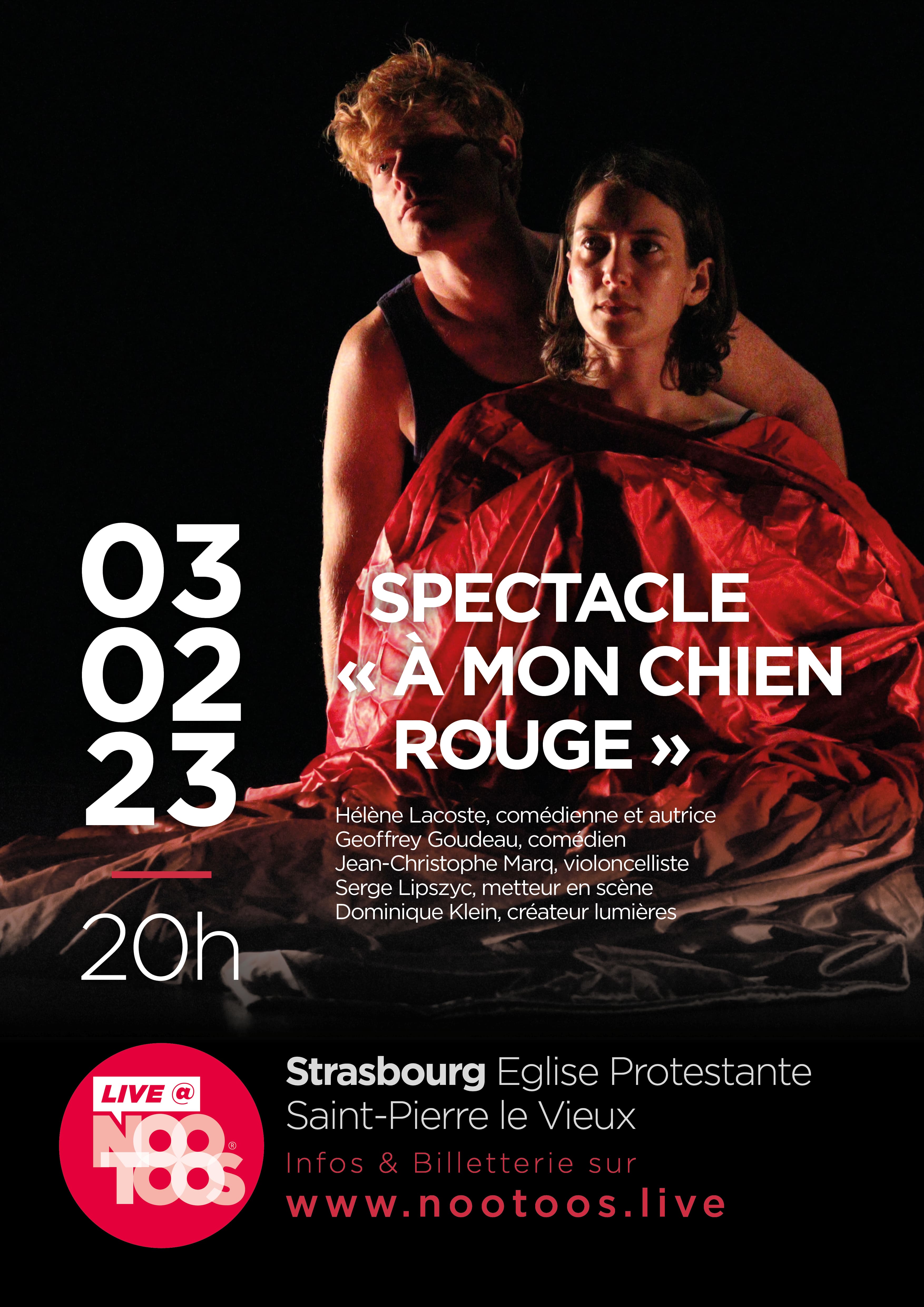 Live@Nootoos propose une pièce de théâtre intitulée "À mon chien rouge" le vendredi 3 février à 20h à l'église protestante Saint-Pierre le vieux // NooToos. Le couple, l'animalité, l'impossibilité de se rencontrer dans la nuit de la chambre, et pourtant ce désir intarissable de n'être plus qu'un, de s'attacher l'un à l'autre jusqu'au début du jour.