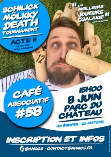 La seconde édition du Mölkky Death Tournament se tiendra le samedi 8 juin prochain lors du café associatif 58 de l’AHQCS au parc du Château à Schiltigheim. Cette compétition amicale d’envergure sidérale, accueillera non pas les 40 meilleures équipes de joueuses et joueurs de la galaxie. Choisissez votre partenaire, préparez vos combinaisons et offrandes conviviales, armez vous de bonne humeur et courrez vite vous inscrire par mail (contact AT ahqcs POINT fr) ou sur la page facebook de l’évènement. Le tournoi se conclura par une remise des prix en grandes pompes et apéro partagé à 19h00.
