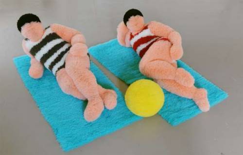 Cette performance est une déclinaison vivante et amusée, pendant laquelle un couple de grosses poupées en maillots à rayures, entièrement en tulle plissé, rejoue des scènes de bord de mer. Bain de soleil, farniente, jeux, et autres postures typiques des baigneurs : elles s’activent lentement autour de deux grandes serviettes bleues et d’un ballon jaune en tulle. Loin des bords de mer, ces personnages tout en rondeurs réveillent l’imaginaire des flâneurs et des spectateurs de passage.