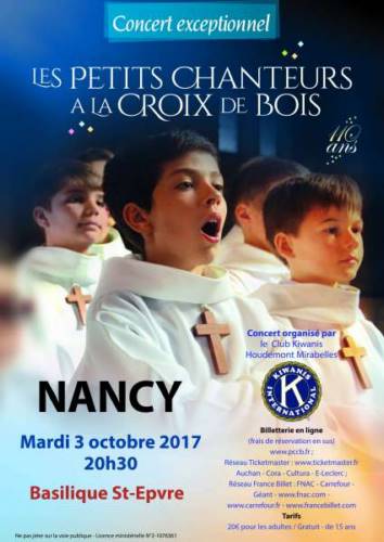 Le mardi 3 octobre 2017, à 20 h 30, à la Basilique Saint-Epvre de Nancy, le club Kiwanis Houdemont Mirabelles organise un concert exceptionnel des Petits Chanteurs à la Croix de Bois, dans le cadre des 110 ans de La Manécanterie.