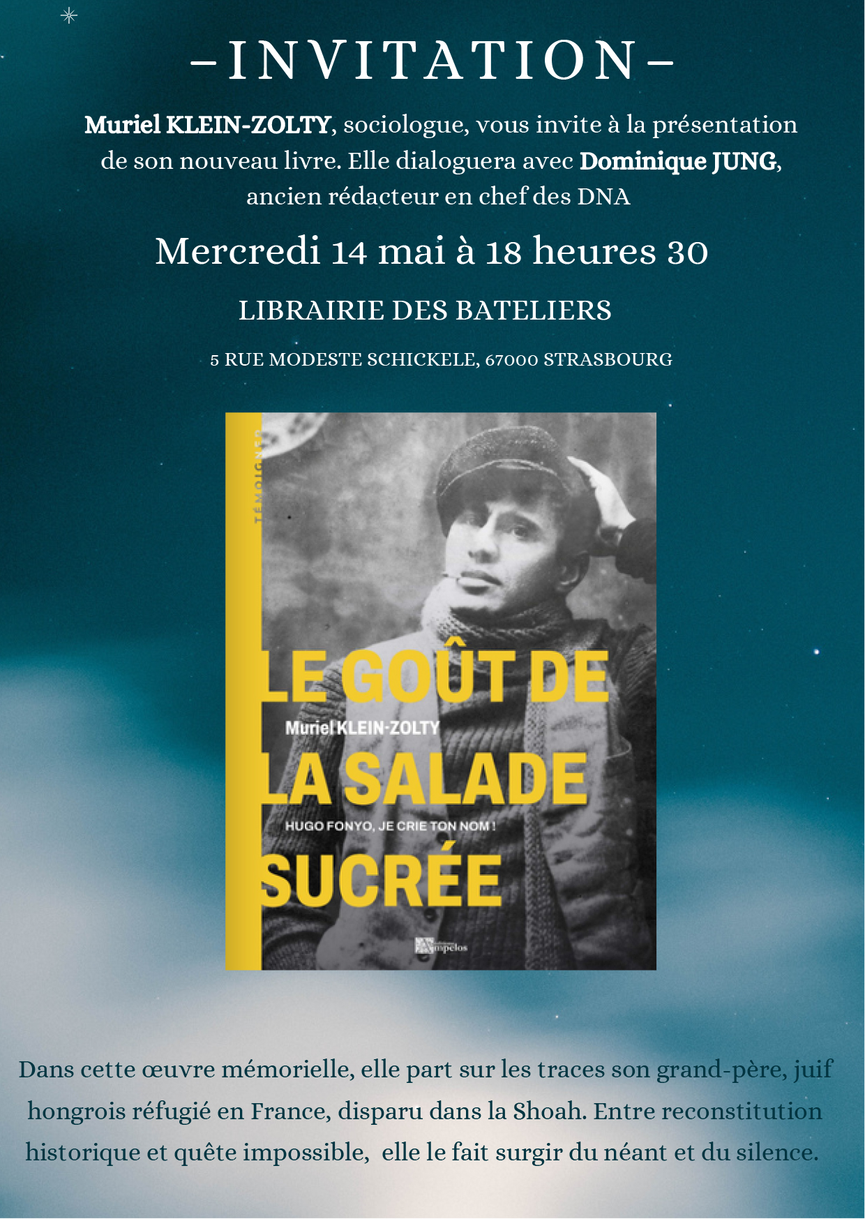 Muriel Klein-Zolty, sociologue  et biographe, présentera son dernier ouvrage "Le goût de la salade sucrée - Hugo Fonyo je crie ton nom" (Ed. Ampélos) à la librairie des Bateliers 5 rue Modeste Schickelé à Strasbourg le mercredi 14 mai à 18h30.