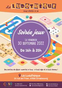 Rendez-vous à la première soirée jeux de la Ludo’ : animation, convivialité et plaisir seront au rendez-vous autour de jeux de société pour finir la semaine dans une ambiance ludique ! En famille, entre jeunes, à tout âge, seul ou à plusieurs, cet instant inédit est ouvert à tous et à tous les niveaux, débutant ou confirmé, guidé par l’expérience des ludothécaires qui seront présents sur place. Ce moment de rencontre et de partage entre adhérents, habitants et habitués du quartier du Conseil des XV se déroulera le vendredi 30 septembre 2022 de 16h à 20h, à la Ludothèque au 24 rue de l’Yser à Strasbourg.