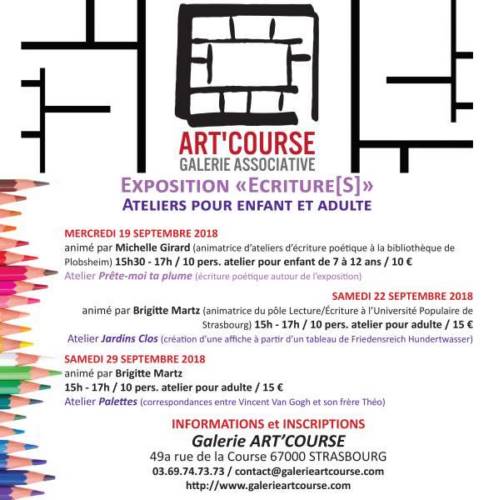 A l’occasion de l’exposition « Écriture[S] », la Galerie Art’Course est heureuse de vous proposer plusieurs ateliers de créations plastiques qui vous feront découvrir toute la richesse et les possibilités de la lettre et de l’écriture !