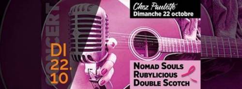 Envie d’un dimanche aprem en musique et de contribuer à une bonne cause? Venez partager les bondes ondes rock, folk, pop acoustiques et plus électriques des Nomad Souls, Rubylicious et Double Scotch ! La recette des entrées sera reversée aux soins de support de l’Institut de Cancérologie de Lorraine - Alexis Vautrin. Parce que le soin à l’hôpital c’est aussi être attentif au bien-être, les fonds bénéficieront à la socio-esthétique et à l’aromathérapie. Nous avons attendons nombreux !