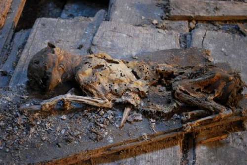 Photo. Cadavre de chat déposé sous un plancher de comble.