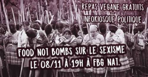 Une fois par mois depuis un an et demi, nous récupérons de la nourriture toujours comestible qui devrait être jetée (date limite de consommation dépassée de quelques jours, fruits et légumes trop moches pour être vendus), nous la cuisinons et nous la distribuons gratuitement ! Toute la nourriture est végane car nous refusons l’exploitation des animaux, et aussi pour montrer que la nourriture végétalienne peut être bonne et équilibrée ! :)