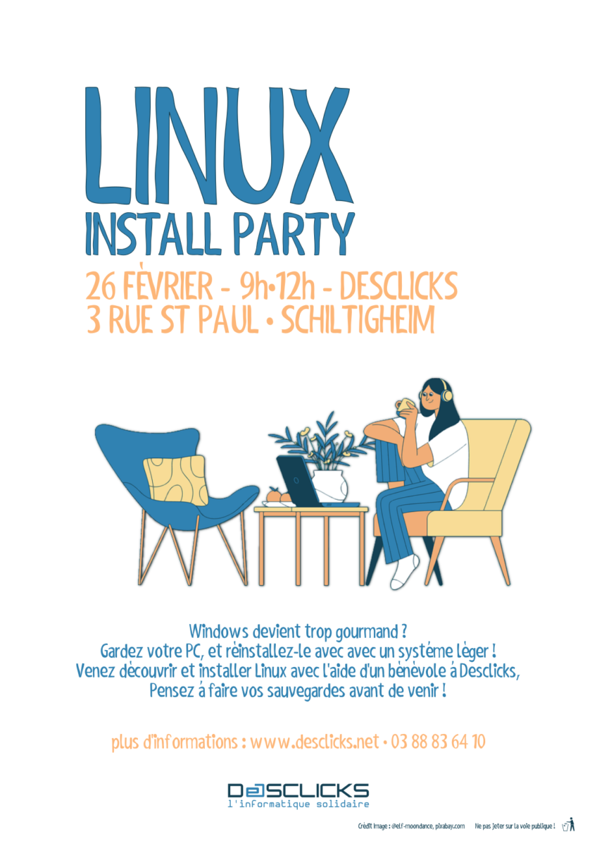 Pour vous accompagner dans la transition, l’association Desclicks – L’Informatique Solidaire organise le samedi 26 février 2022 de 9h à 12h une Install Party Linux dans ses locaux du 3 rue St Paul. Au cours de l’Install Party vous pourrez tester un système Linux directement sur votre ordinateur et apprendre à l’installer avec l’aide des bénévoles engagés dans l’association.
