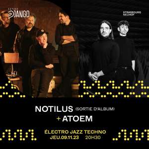 Entre jazz, ambient et techno, le quintet Notilus revient avec un nouvel album sur le précieux label allemand Denovali. Après une semaine de résidence intense à Django, ils seront fin prêts à vous présenter une expérience scénique plus organique, plus brute et plus libre que jamais ! Laissez-vous enlacer par de longues plages dansantes, aussi propices à l’introspection qu’à l’exutoire. Mais pas de sortie d’album sans fête mémorable ! ATOEM complète donc la soirée, un duo qui délivre un live calibré, face à face, entouré de ses multiples machines. Autant de prothèses électroniques dont le roi est un synthétiseur modulaire d’un mètre sur un mètre, délivrant des boucles semi-aléatoires, laissant une partie de ces musiques au hasard. Une soirée qui va vous changer les idées, pour de vrai !